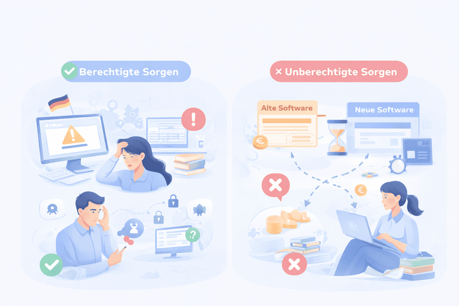 In diesem Artikel geht es genau darum, diese Sorgen einzuordnen. Welche Bedenken sind tatsächlich berechtigt und sollten ernst genommen werden und welche entstehen eher aus Unsicherheit oder veralteten Erfahrungen? Ziel ist es, eine realistische Grundlage für die Entscheidung zu schaffen und den Softwarewechsel als das zu betrachten, was er ist eine Veränderung, die gut planbar ist, wenn man die richtigen Punkte kennt.